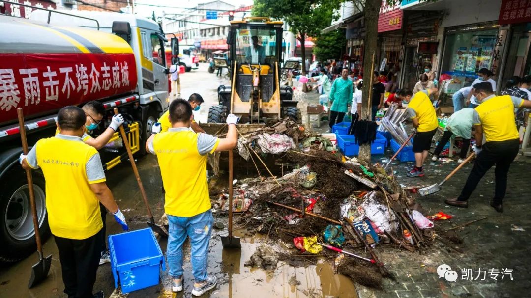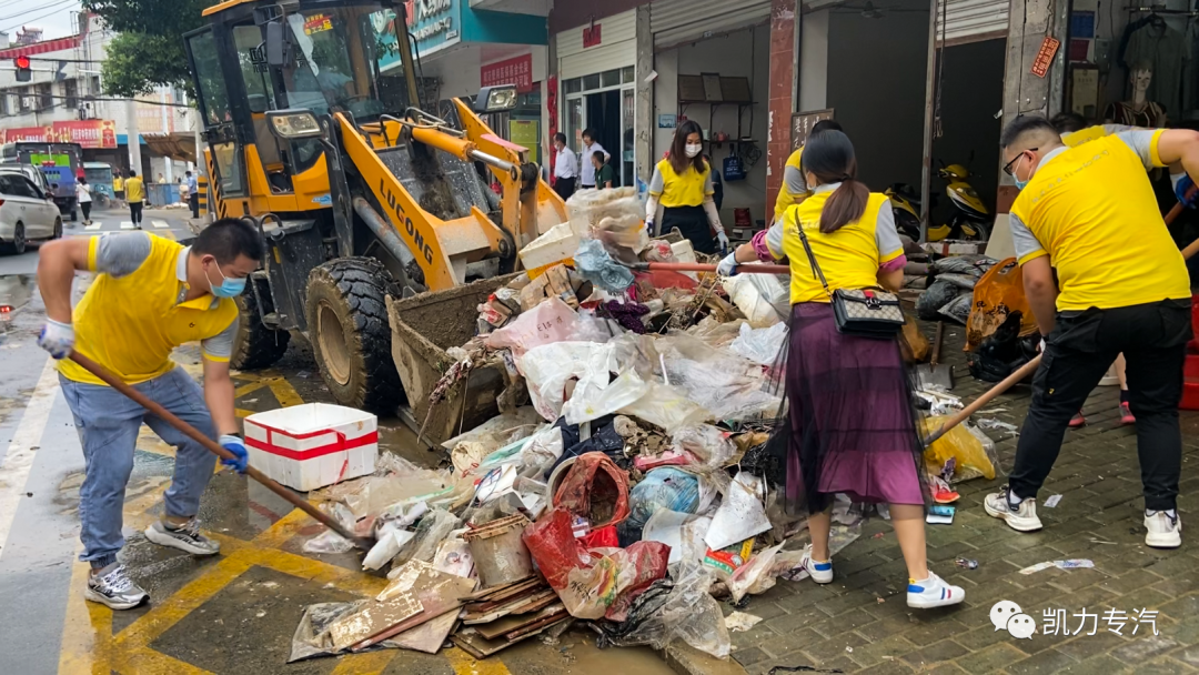 在何店镇灾区现场,随处可见灰黄色的靓丽身影,凯力人不畏艰难,不辞辛苦,踏着泥泞,挥洒汗水,用铁锹一把把铲起因暴雨洪水冲刷而产生的泥沙和杂物,热情主动的帮助灾民清洗生活用品、清理街道杂物。派出的应急救援车辆采用机械化交替作业模式,抽、吸、扫、冲、洗、喷各种功能尽显环卫保洁身手,大大提高灾后重建工作效率。人机不停,连续数小时投入救援工作,快速恢复道路环境秩序。凯力人用坚定的步伐和满身的汗水温暖着灾区人民,用实际行动和无私奉献践行着凯力人的责任与担当。