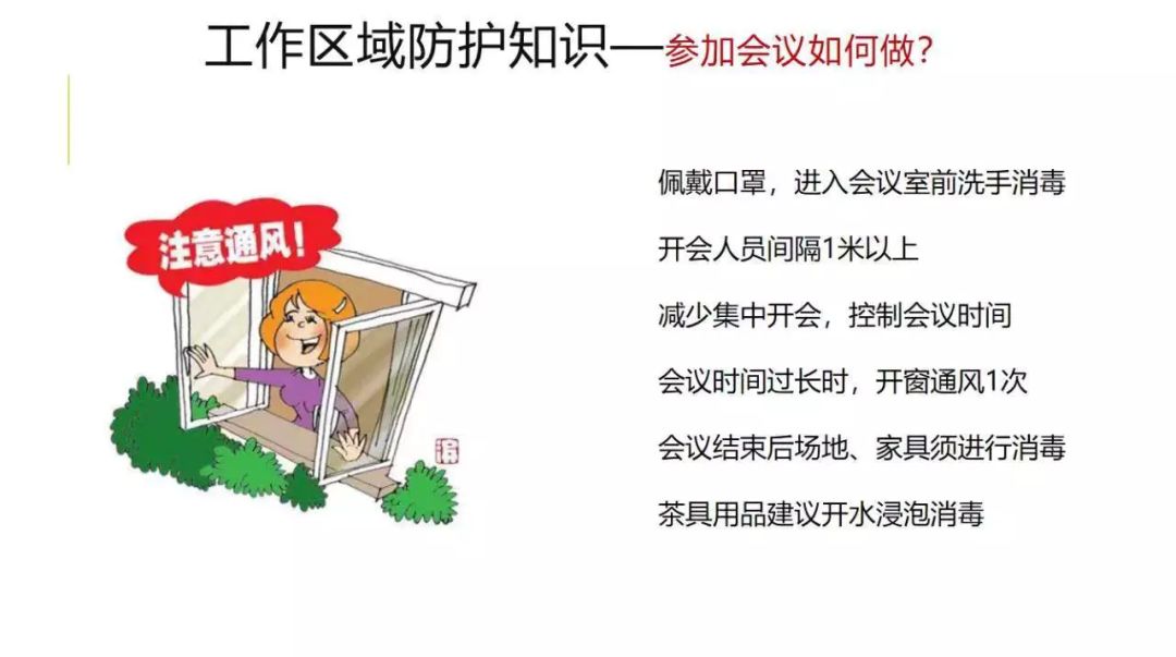 建议佩戴口罩,进入会议室前洗手消毒。开会人员间隔1米以上。减少集中开会,控制会议时间,会议时间过长时,开窗通风1次。会议结束后场地、家具须进行消毒。茶具用品建议开水浸泡消毒。