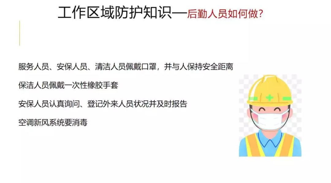 服务人员、安保人员、清洁人员工作时须佩戴口罩,并与人保持安全距离。食堂采购人员或供货人员须佩戴口罩和一次性橡胶手套,避免直接手触肉禽类生鲜材料,摘手套后及时洗手消毒。保洁人员工作时须佩戴一次性橡胶手套,工作结束后洗手消毒。安保人员须佩戴口罩工作,并认真询问和登记外来人员状况,发现异常情况及时报告。