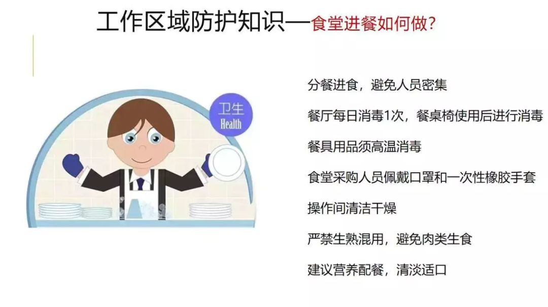 采用分餐进食,避免人员密集。餐厅每日消毒1次,餐桌椅使用后进行消毒。餐具用品须高温消毒。操作间保持清洁干燥,严禁生食和熟食用品混用,避免肉类生食。建议营养配餐,清淡适口。