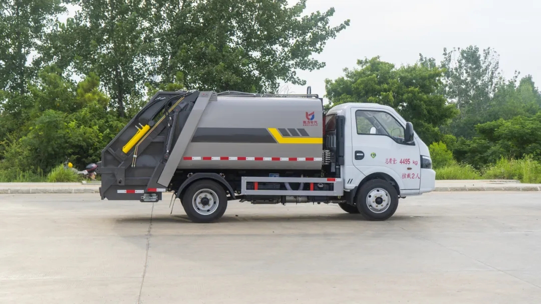 凯力KLF5041ZYSE6型5.3方压缩垃圾车,基于东风途逸底盘(轴距2800mm)开发,车身高度仅2250mm,行业最低,上蓝牌可下地下车库,专为极端限高场景设计。