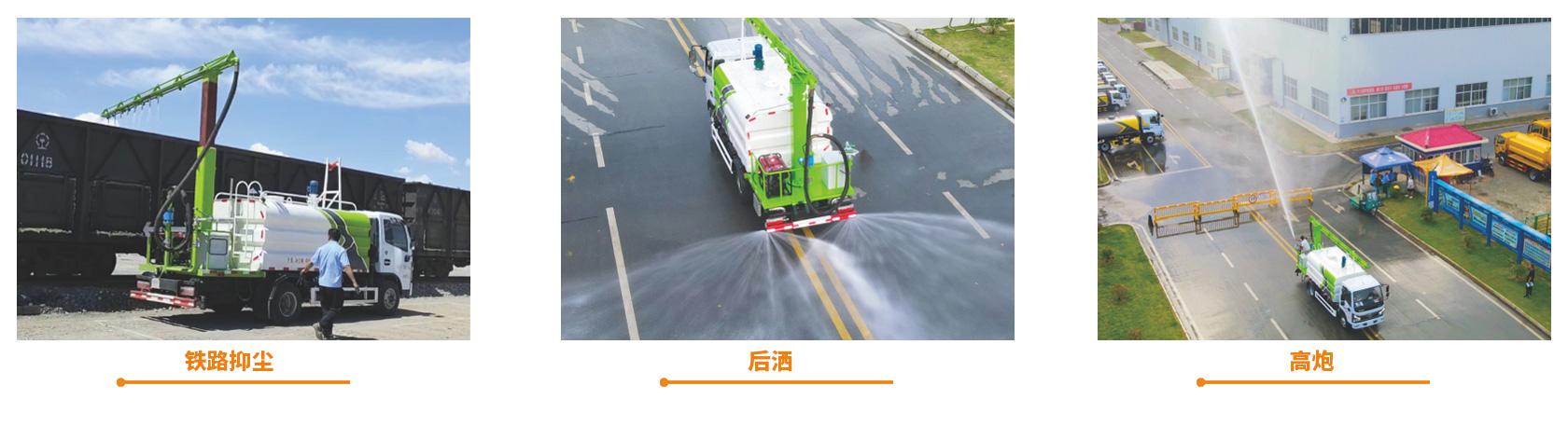 配置洒水泵,增加绿化喷洒功能,能在紧急情况下进行低压消防洒水作业,可一车多用。所有洒水系统阀门均可在驾驶室内加装气动控制开关,节约人工成本,降低作业人员劳动强度。