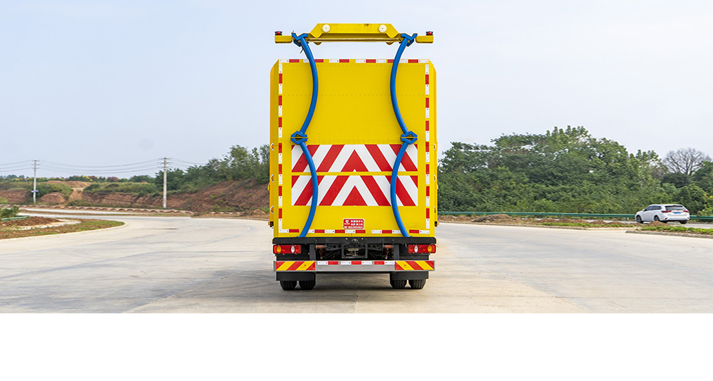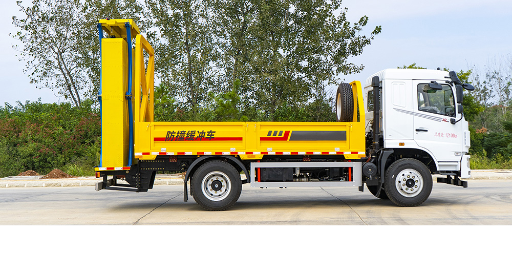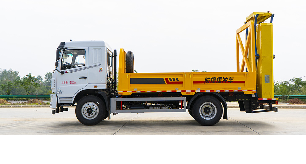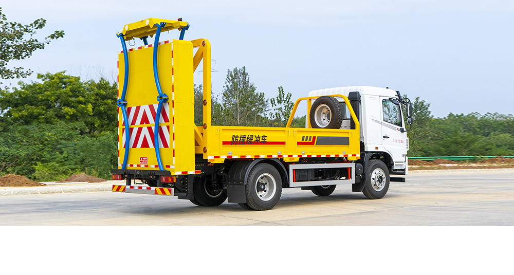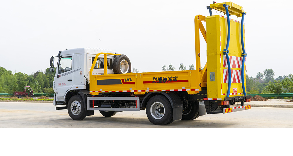 防撞缓冲垫具有两级吸能功效,金属弧形弯管结构在碰撞发生时,弧形管先期吸收巨大的初始碰撞能量,当碰撞能量造成弧形弯管变形后,充满缓冲材料的结构进入变形吸能状态。在碰撞过程中,防撞缓冲垫所有吸能材料和变形部件均被有效包裹在防撞缓冲垫内,不允许任何材料飞溅到其他相邻车道。缓冲垫工作及行驶过程中均具备同步灯光系统(转向灯、刹车灯、驻车灯,条形爆闪灯等)。