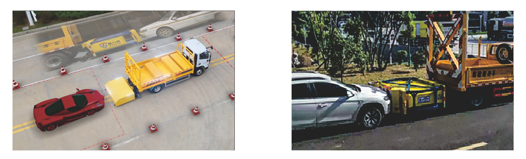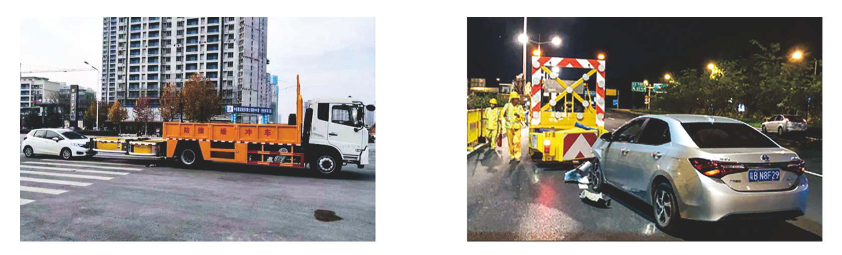 防撞缓冲垫具有两级吸能功效,金属弧形弯管结构在碰撞发生时,弧形管先期吸收巨大的初始碰撞能量,当碰撞能量造成弧形弯管变形后,充满缓冲材料的结构进入变形吸能状态。在碰撞过程中,防撞缓冲垫所有吸能材料和变形部件均被有效包裹在防撞缓冲垫内,不允许任何材料飞溅到其他相邻车道。缓冲垫工作及行驶过程中均具备同步灯光系统(转向灯、刹车灯、驻车灯,条形爆闪灯等)。
