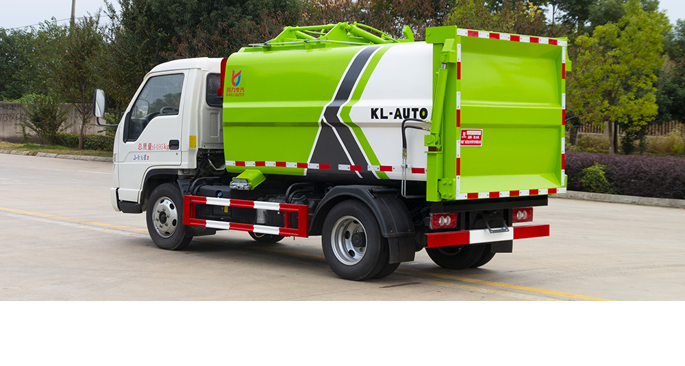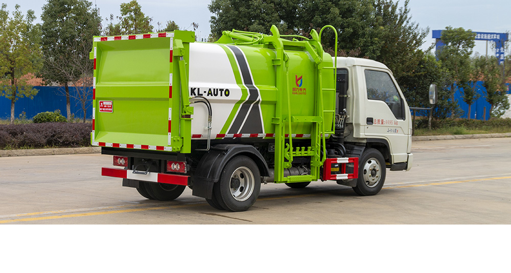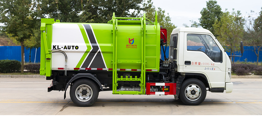 凯力风侧装压缩式垃圾车是通过拉杆提升垃圾桶自动倒入垃圾,并往车厢后方推动挤压垃圾,达到压缩垃圾的目的,压缩原理是采用机、电、液压联动控制系统、电脑控制及手动操作系统,通过填装器和推铲等装置实现垃圾倒入、压碎或压扁,并将垃圾挤入车厢压实和推卸。