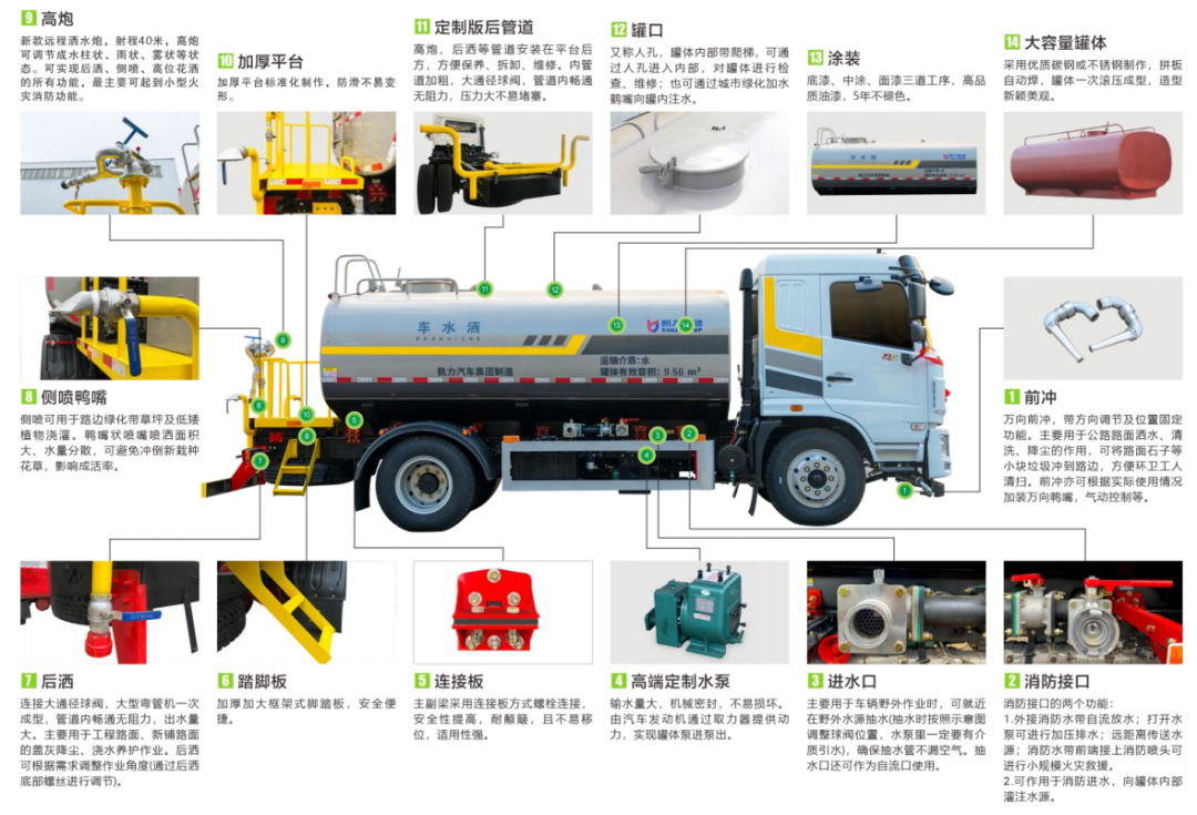 产品标配前冲、后洒、侧喷、后置式工作平台、平台上有高压水炮(可360°旋转,水雾形状可调成直冲状、 大雨、 中雨、 小雨、毛毛雨;调成直冲状最大射程≧ 35 米,也可调成雾状最大射程≧15 米)、配备优质大功率专用洒水泵,品牌取力器、杂物过滤网、国标通用65型消防接口(可通过消防栓加水)、1 套自流球阀系统(可自吸自排,最大吸程 7 米)、2根引水钢丝胶管。适用于各种路面清洗;树木、绿化带、草坪绿化;道路、厂矿企业施工建设、高空建筑冲洗。具有洒水、压尘、高(低)位喷洒、农药喷洒、护栏冲洗、应急消防等多种功能。
