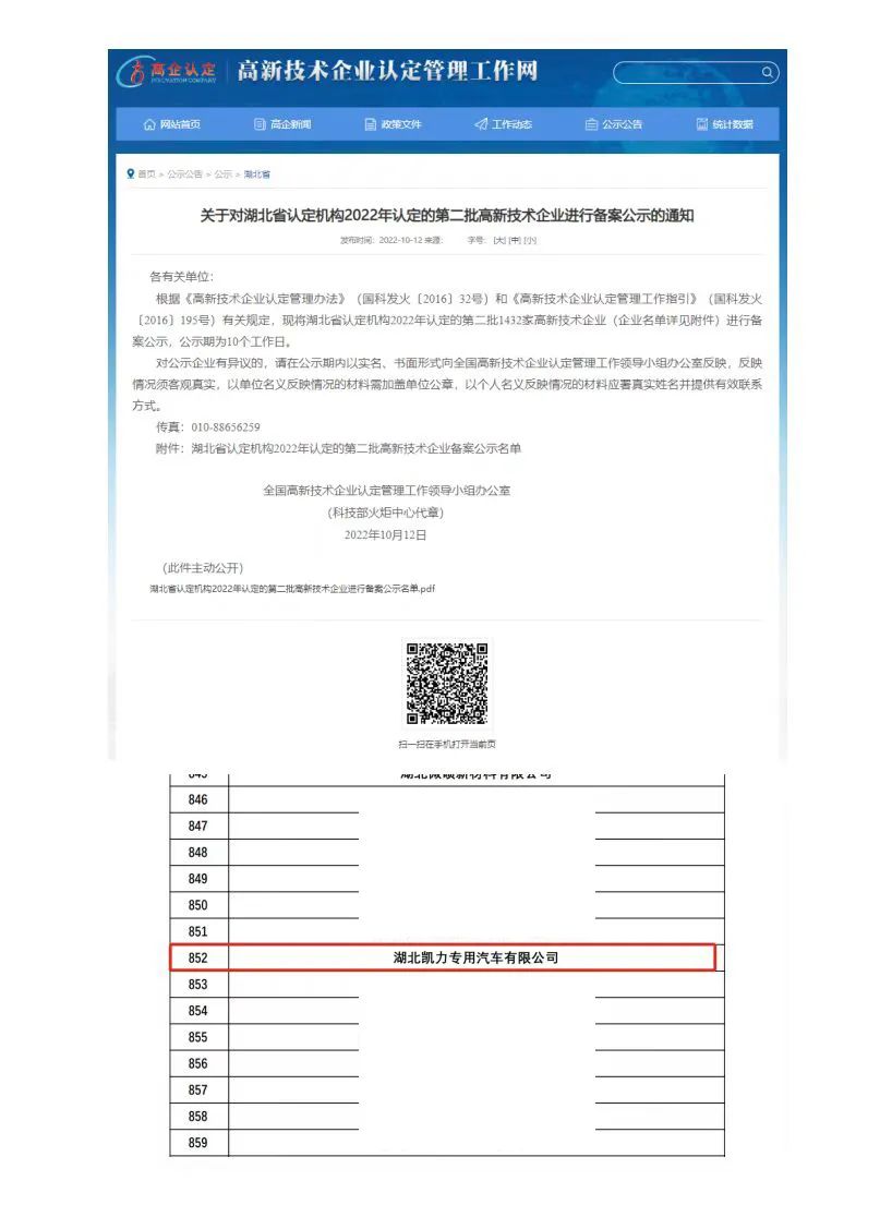 近日,由国务院主导,科技部、财政部、税务总局组成全国高新技术企业认定管理工作领导小组发布公告,湖北凯力专用汽车有限公司喜获2022年高新技术企业备案认定,证书编号GR202242000607。