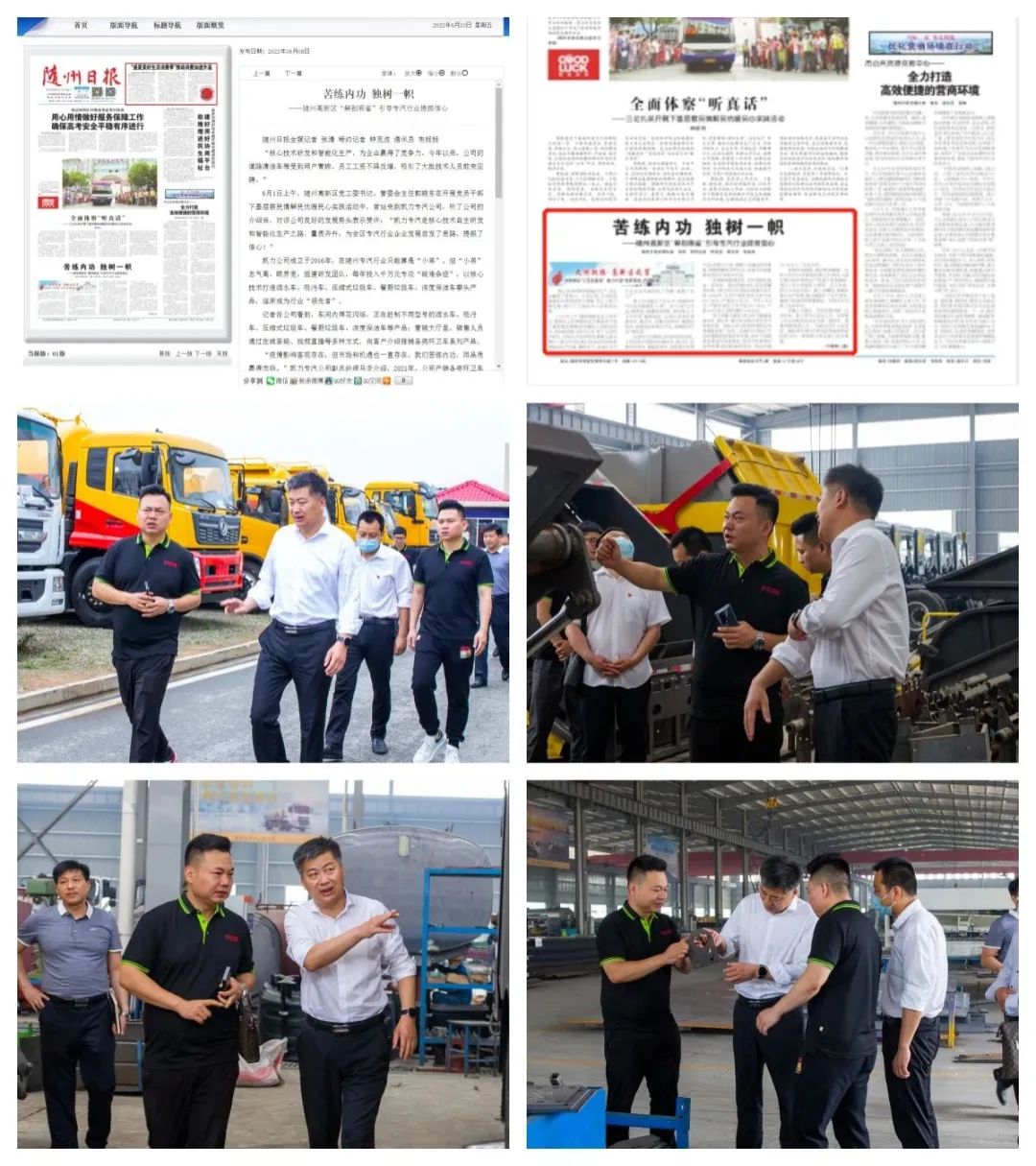随州高新区党工委书记、管委会主任郭晓东在党员干部下基层察民情解民忧暖民心实践活动中,首站来到凯力汽车集团,对公司良好的发展势头表示赞许,“凯力专汽走核心技术自主研发和智能化生产之路,量质齐升,为全区专汽行业企业发展启发了思路、提振了信心!”随州日报6月8日首版要闻报道。