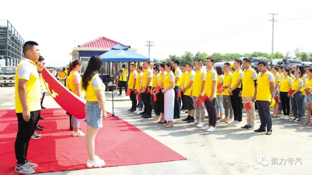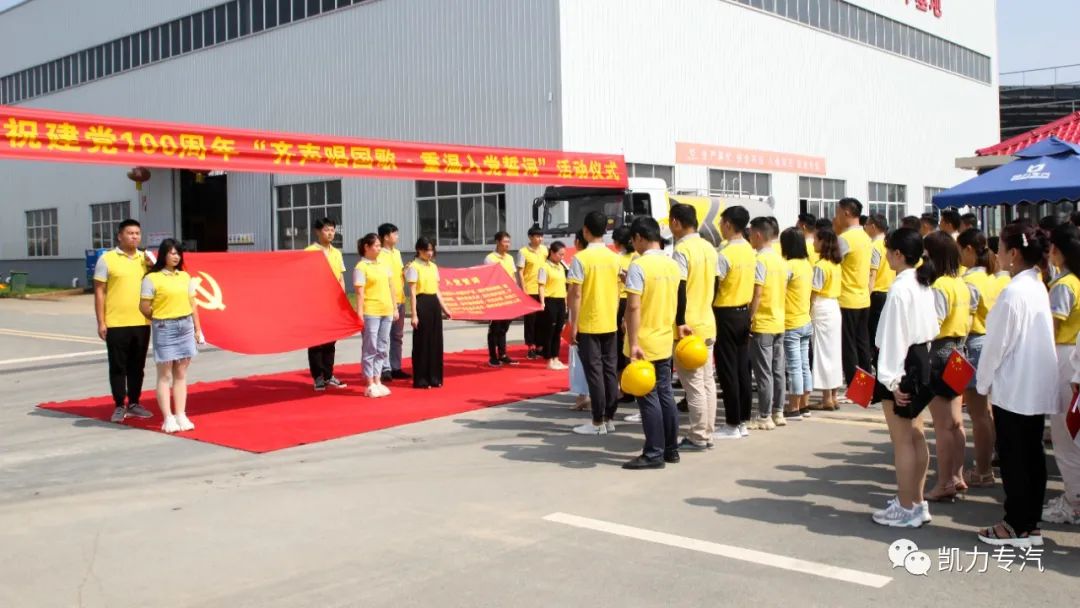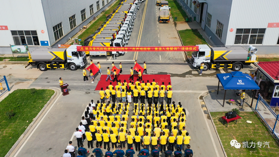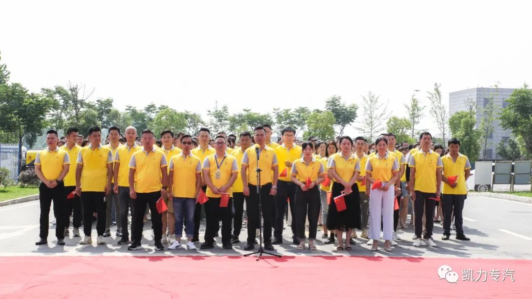 6月29日上午,在中国专用车现车基地凯力集团开展了以“全员齐声唱国歌,党员干部重温入党誓词”为主题的庆“七一”活动,为建党百年送祝福。中国共产党党员、凯力集团董事长梁杰、总经理梁俊及公司518名员工参加活动。
